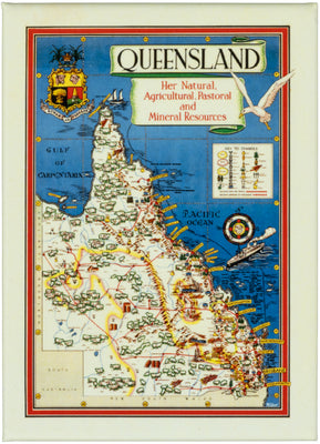 A Fridge magnet features a captivating image known as 'Queensland Resources Illustrated Map' from the State Library of Queensland’s collection. Perfect for adding a touch of cultural refinement to your kitchen or office, it celebrates Queensland’s rich heritage while serving as a stylish accessory.
