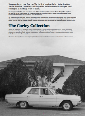 During the 1960s and 70s Frank and Eunice Corley took over a quarter of a million photographs of houses in southeast Queensland. Frank photographed houses from his beloved pink Cadillac, using a Leica camera to capture houses on the opposite side of the street while ‘steering with his knees’. Eunice developed the film in a portable laboratory set up in the Bedford van she drove close behind. The Corley photographs are a revealing insight into how our Queensland houses were adapted (or not) to ‘home’ our cars.